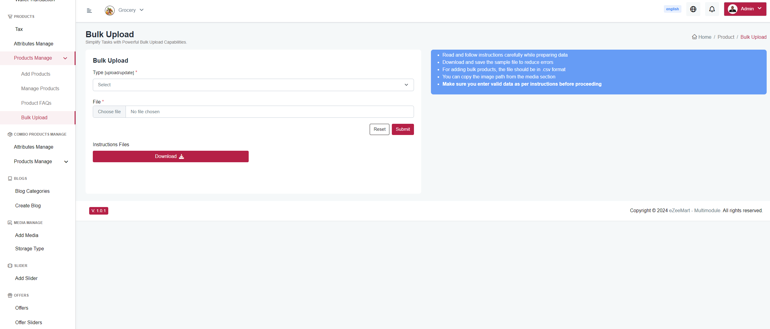 You can bulk upload and update Products from here
