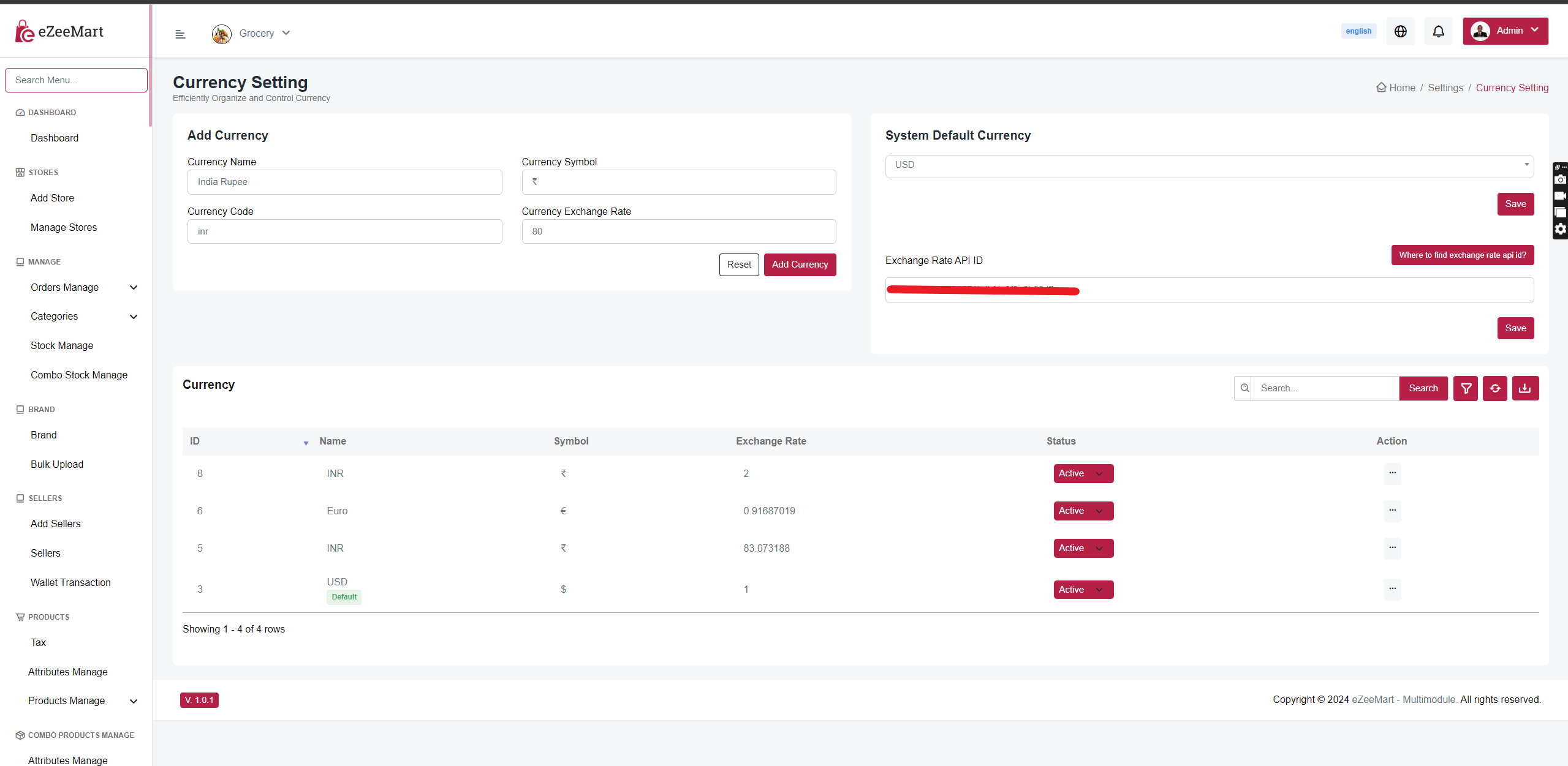 Here, you can add, edit, delete, set the default currency, and also see live currency exchange rates.