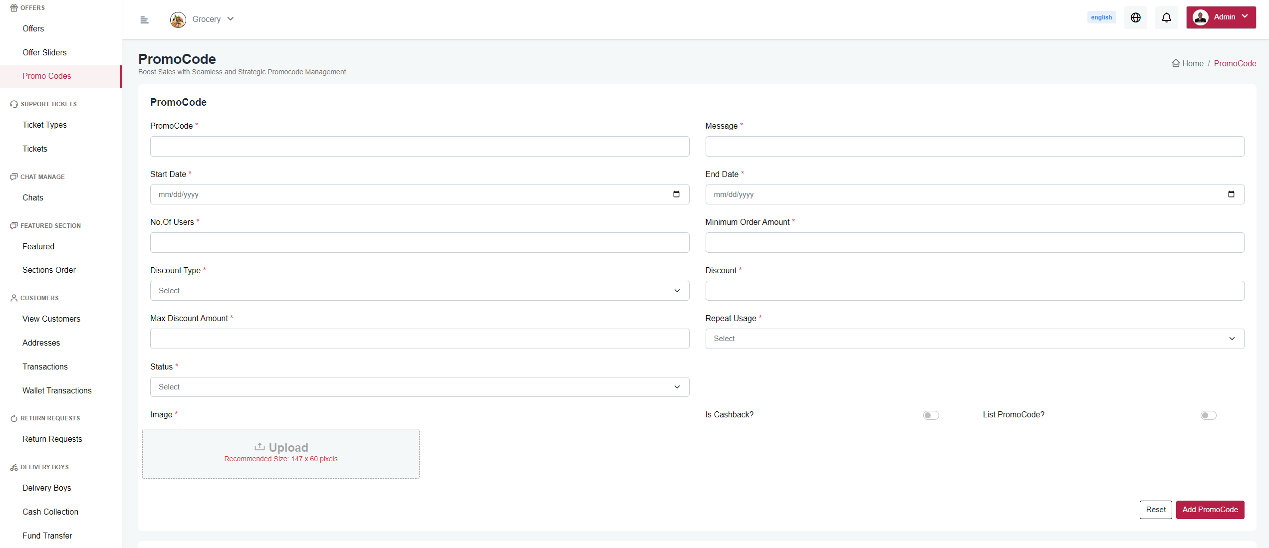 Here you can create promocode for specific time period, repeat usage allowed or not, is cashback promocode ,miminum order amount, maximum discount amount.