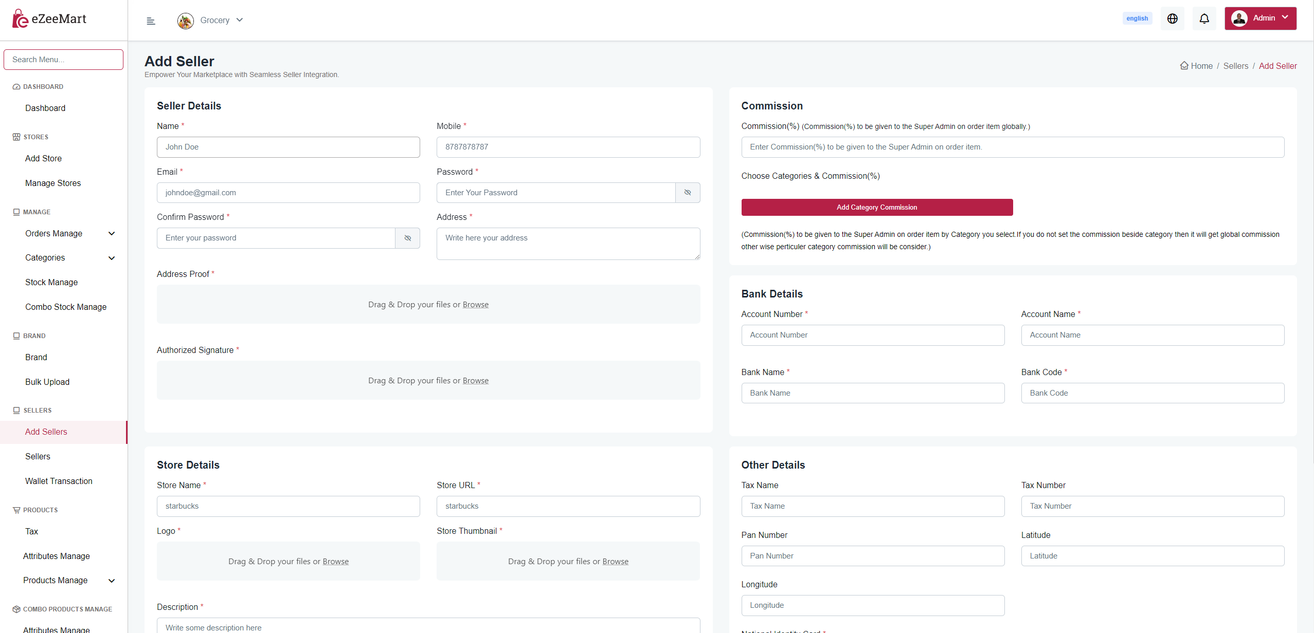 You can create sellers that contain the store name, description, store logo, favicon,permission , admin commission amount etc.. from here