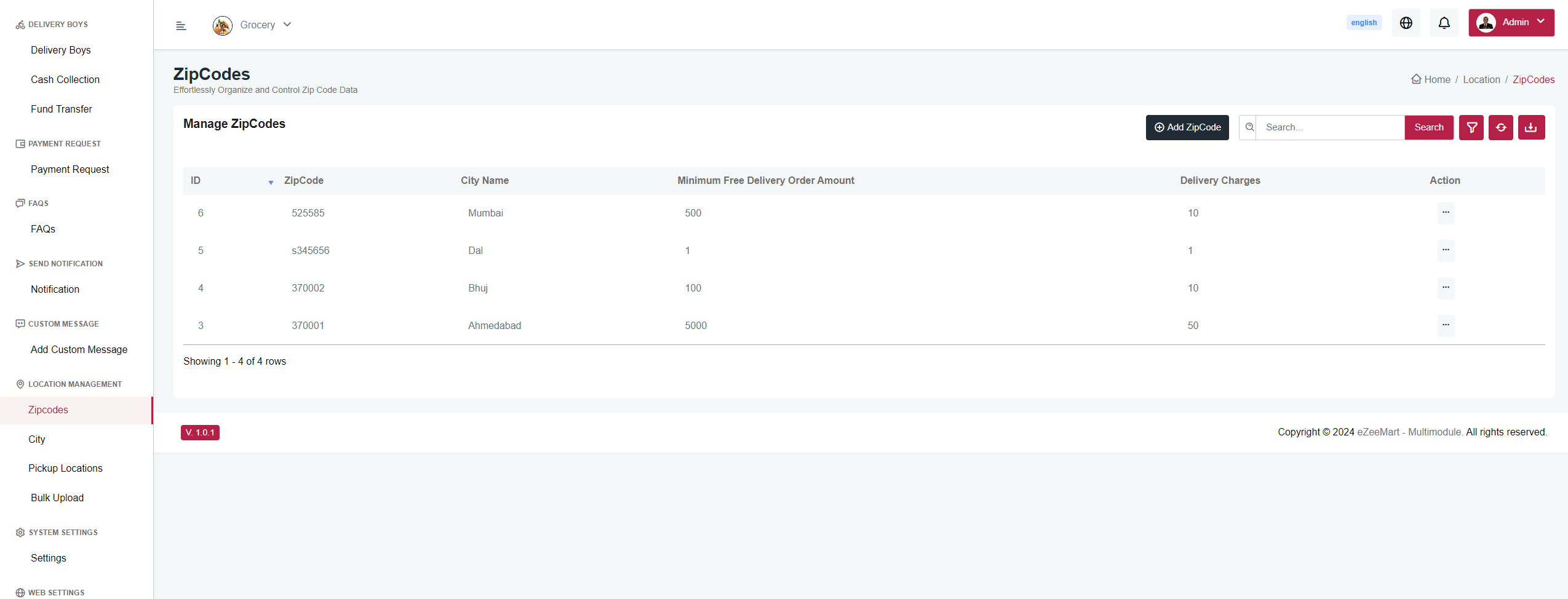 Here, you can create ZIP codes, set city name, set minimum delivery amounts, and specify delivery charges. You can also edit or delete existing ZIP codes