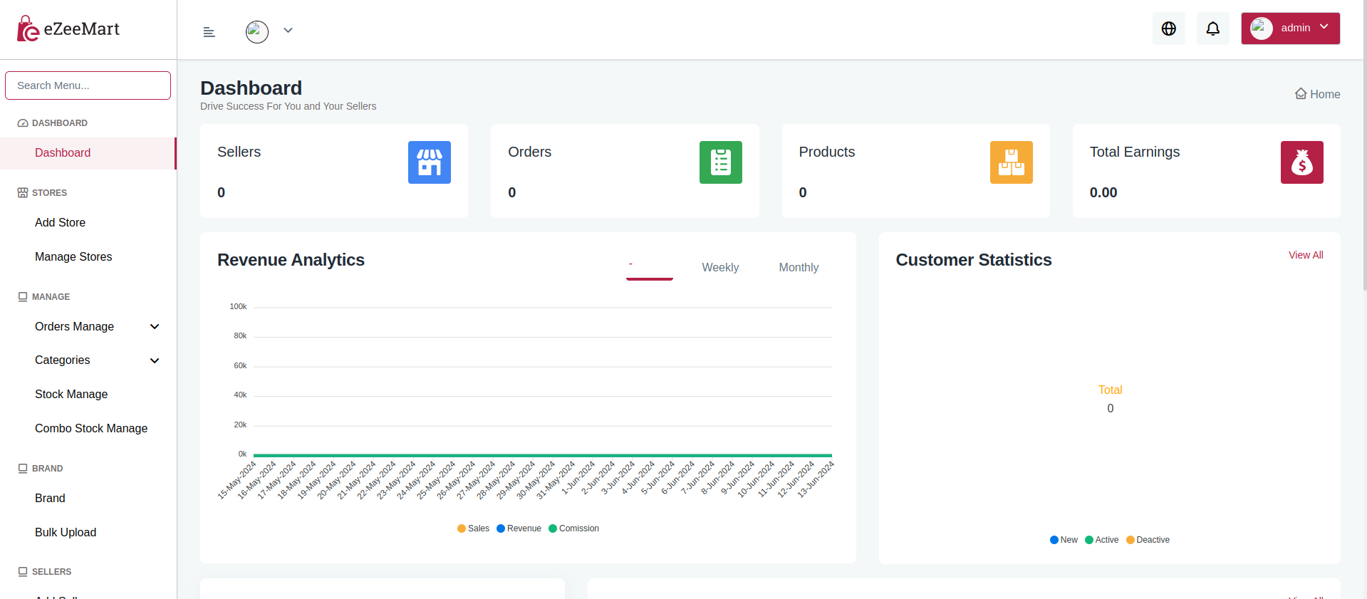 The dashboard contains the sellers, orders and product count and total earnings. It includes recent tickets, recent chats, orders overview, top sellers, and categories. Additionally, it features recent orders, and two charts for revenue analytics and customer statistics.