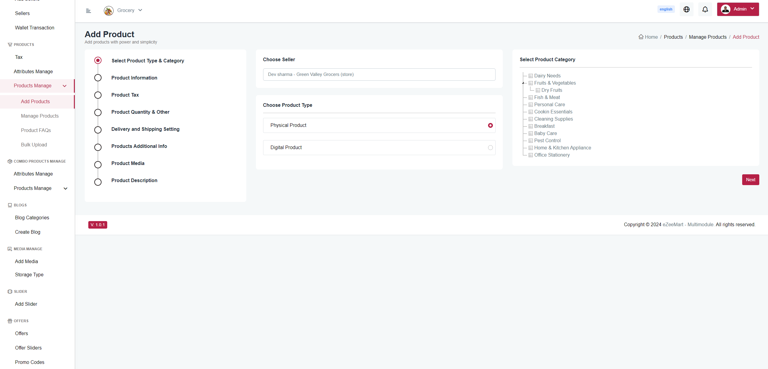 You can create a product that contains basic details like name, description, category, brand, origin ,physical or digital product, tax information, and image. Additionally, you can set product deliverability and shipping settings, manage stock of products, and create variable products