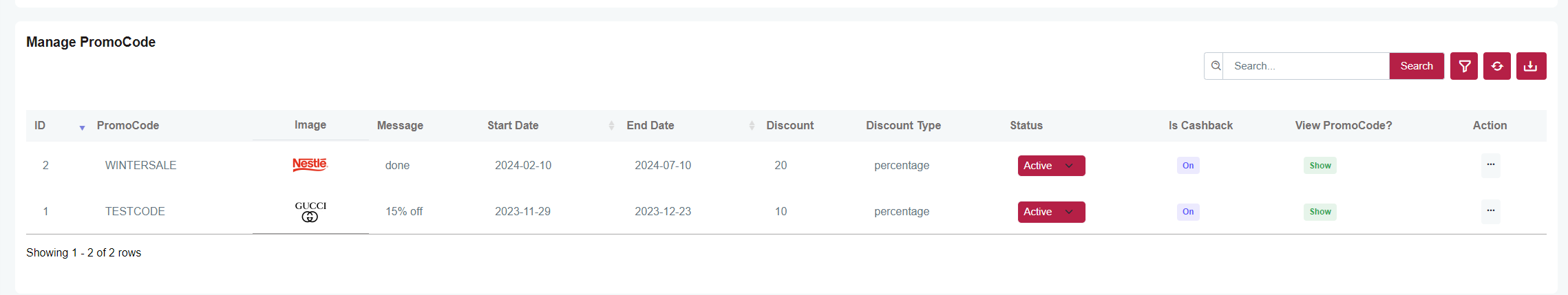 Here you can Edit & Delete PromoCodes.